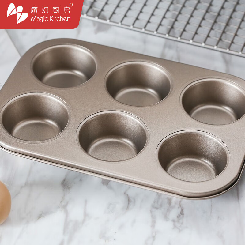 魔幻厨房 6连蛋糕模具金色不粘蛋挞烘焙工具 六连烤箱用diy烘培糕点磨具 不粘6连蛋糕模具-金色-大号